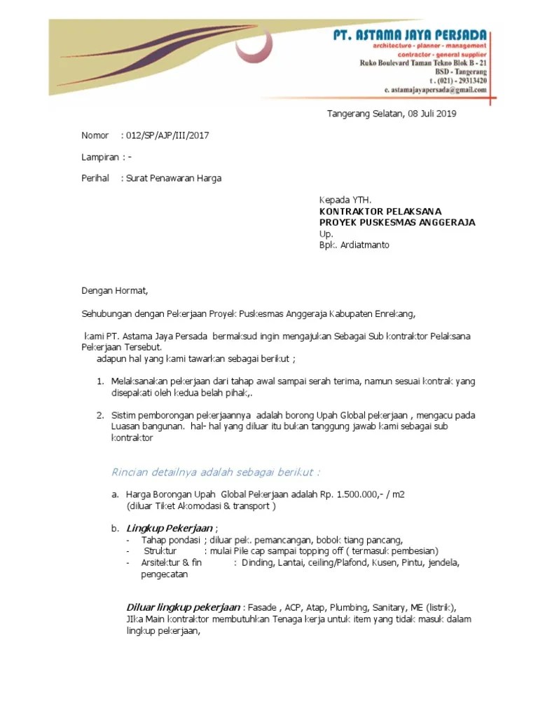 Contoh Surat Penawaran Harga Pekerjaan Proyek - Contoh Surat Penawaran Harga Jasa Konstruksi Nusagates - Contoh surat quotation harga penawaran proyek desain interior.